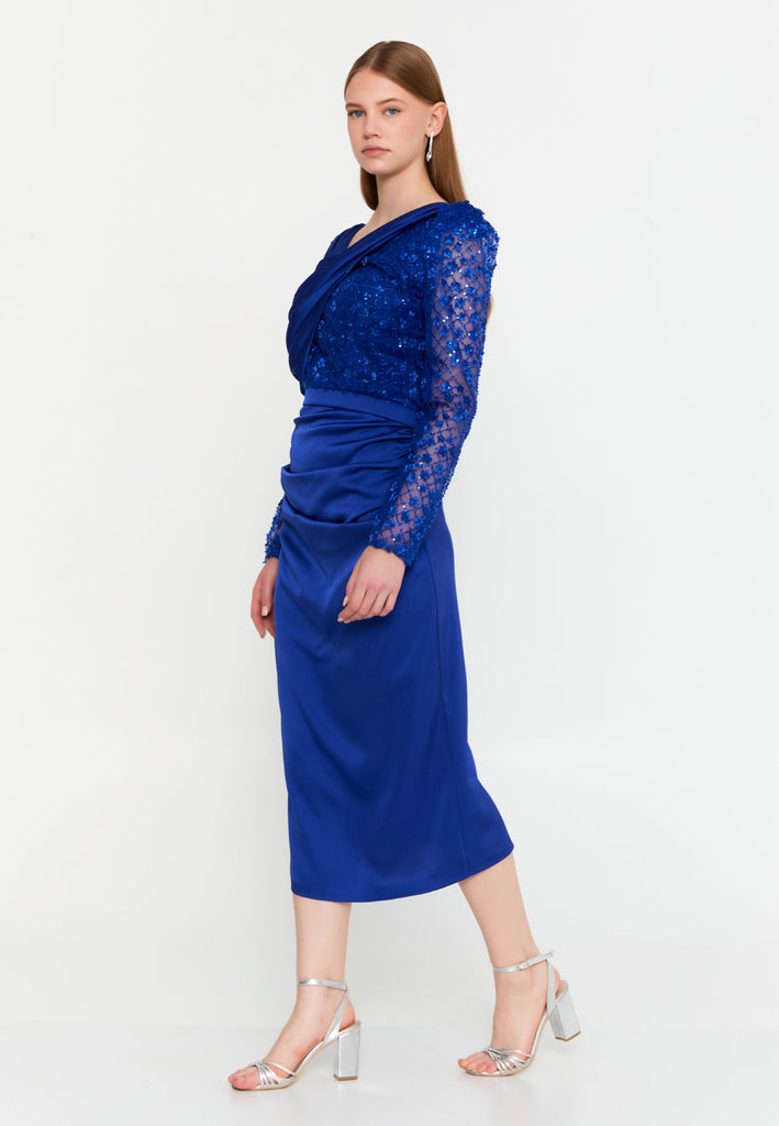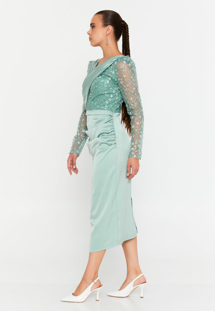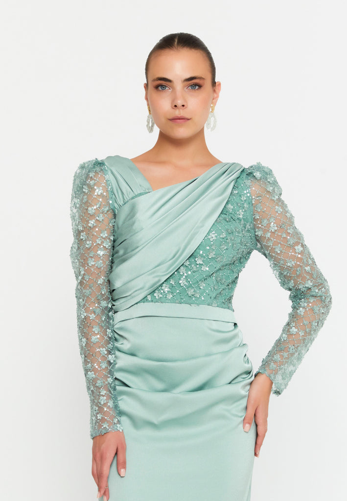 The upper bodice features a delicately draped crossover design, gracefully enhancing the neckline and shaping a natural, feminine contour. The semi-sheer sequin lace sleeves add a touch of allure and sophistication, offering a perfect balance between structure and lightness.