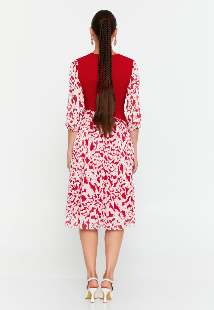 This midi dress seamlessly combines modern sophistication with light, feminine movement. The top is crafted from soft knit fabric with a refined V-neckline and a wrap-style tie at the waist, creating a naturally sculpted silhouette. The semi-sheer sleeves feature delicate abstract prints that add texture and a hint of allure without being overdone.