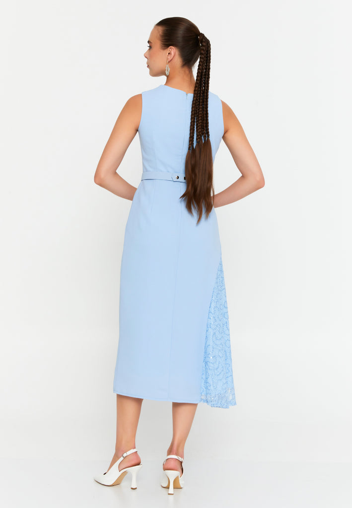The bodice features a tailored fit that contours the body naturally without restricting movement. A cinched waist defines a beautiful hourglass figure, while the semi-sheer lace insert along the skirt adds subtle movement and allure with every step. The harmonious mix of structure and softness makes this piece ideal for any occasion where elegance is key.