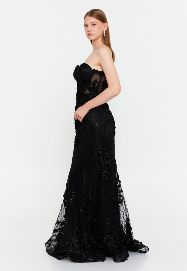 Delicate sheer mesh panels serve as a luminous backdrop for layered floral embroidery and hand-applied sequins. The sparkle is understated yet compelling, catching light in motion rather than shouting for it. The result is a gown that photographs exquisitely and feels couture in presence, perfect for red-carpet entrances, gala dinners, and sophisticated celebrations.